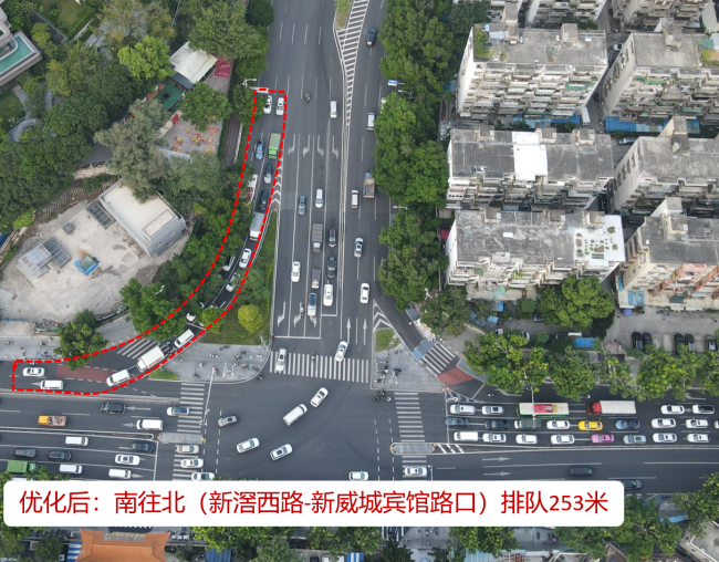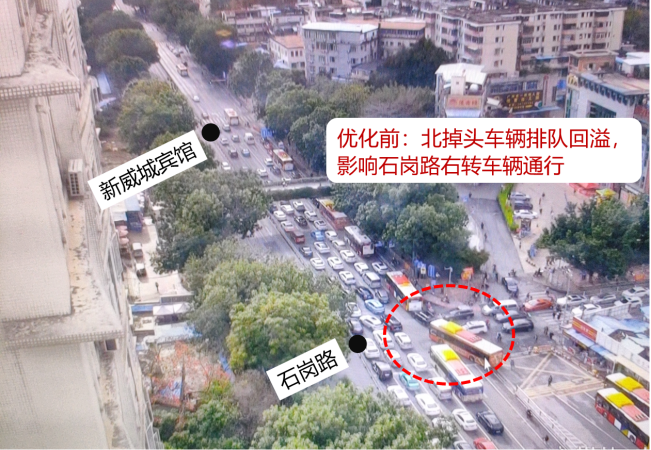 溢出风险消除:新威城宾馆路口北掉头通行能力大幅提升,绿灯时段可基本清空排队车辆,解决了车辆回溢影响上游路口通行的难题,交通循环更顺畅。