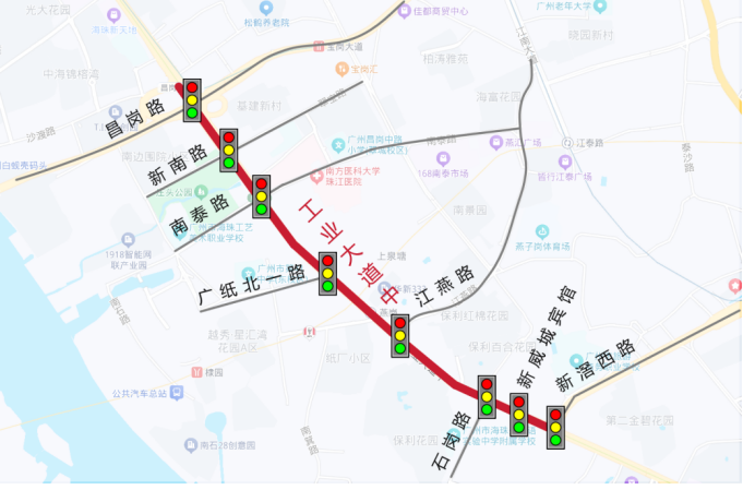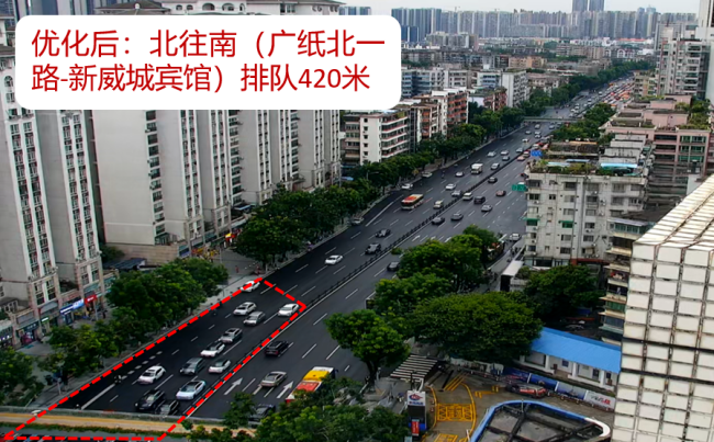 动态调整绿信比:根据路口改造后的流量变化,优化新威城宾馆、广纸北一路等关键路口的绿灯分配比例,重点提升南北直行方向绿信比,均衡路段通行压力。