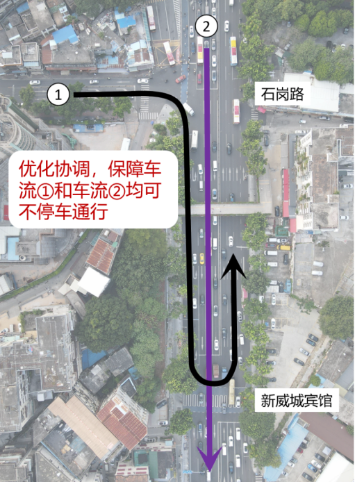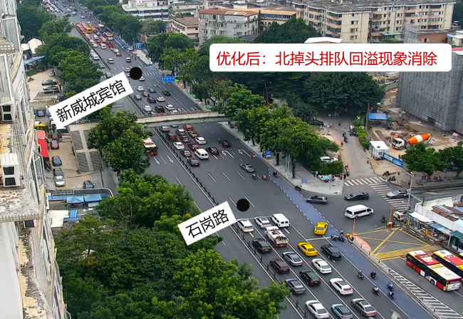 优化路口协调:将石岗路与新威城宾馆路口的协调模式从“防溢出控制”升级为“绿波协调控制”,保障核心车流实现不停车通行,提升路段整体通行效率。