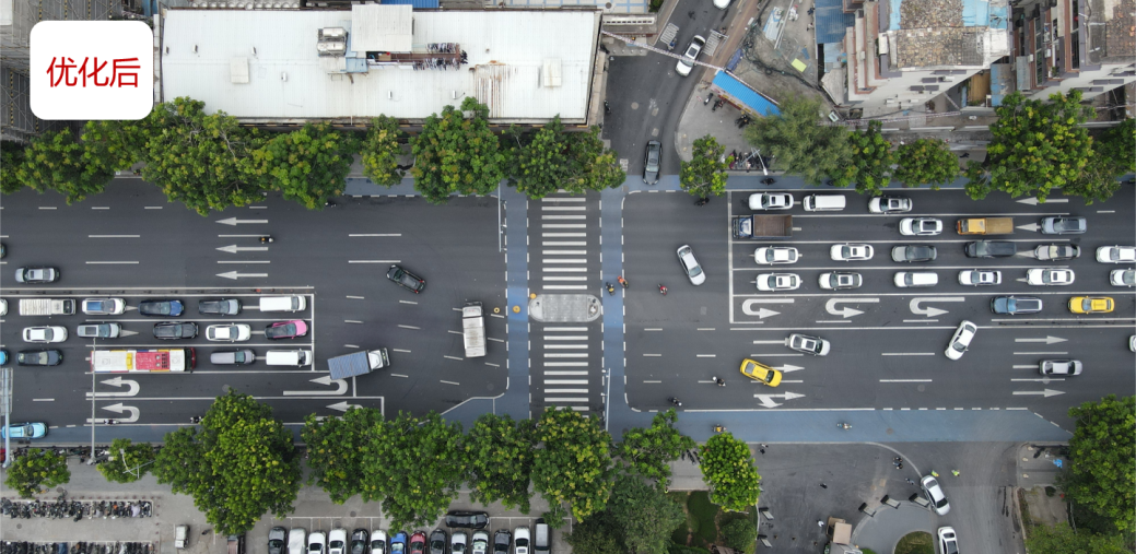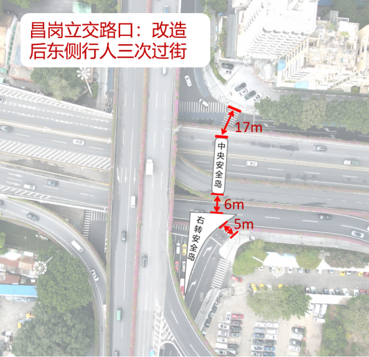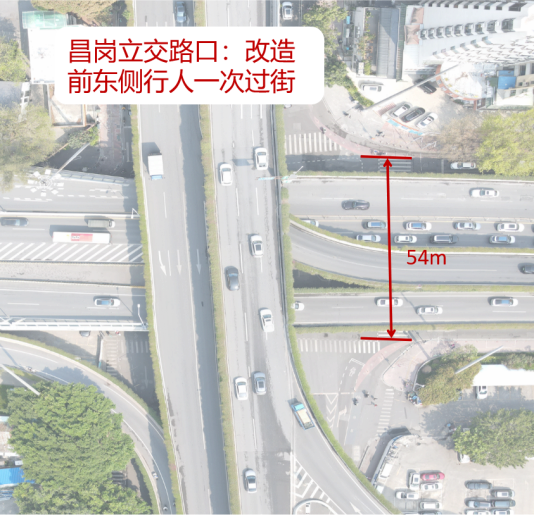 改善过街体验:昌岗立交路口东侧增设中央安全岛与右转安全岛,将54米长的一次过街优化为三次过街,大幅缩短行人单次过街距离,降低滞留风险。