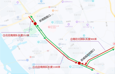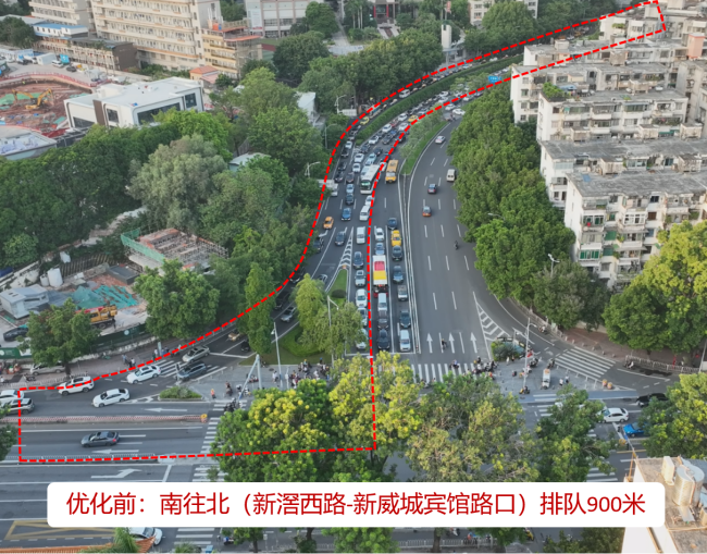 拥堵溢出风险突出:新威城宾馆、新南路等路口成为核心瓶颈,北往南方向最大排队长度达1100米,南往北方向达900米,部分路口因蓄车空间不足,排队车辆回溢至上游路段,形成交通阻滞。