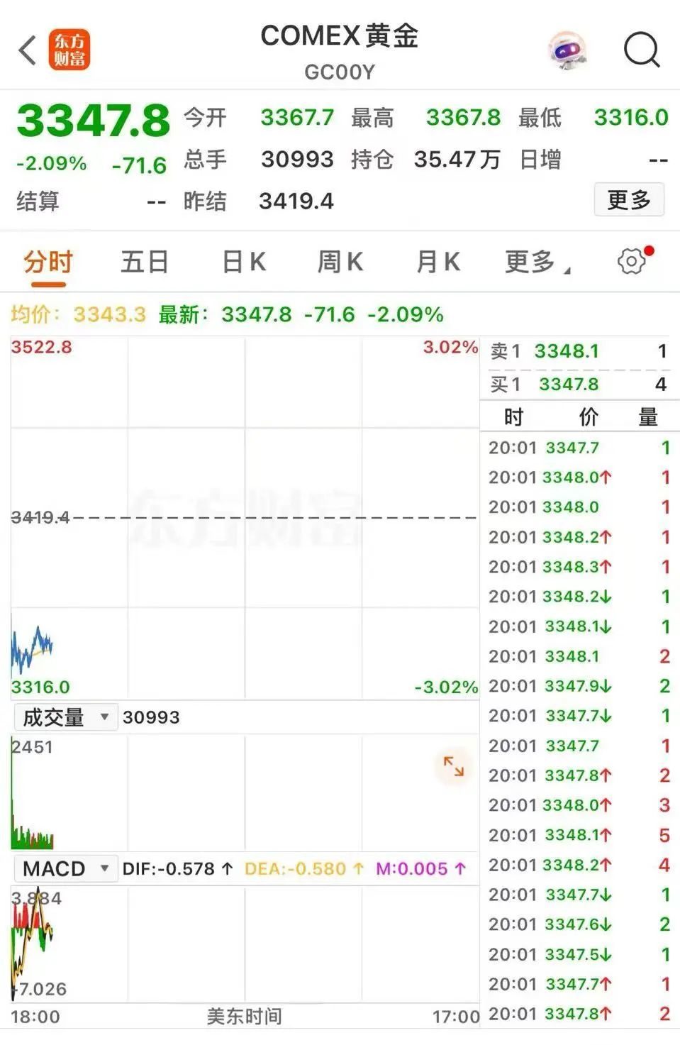 截至发稿,COMEX黄金期货跌超2%,报3347.8美元/盎司。